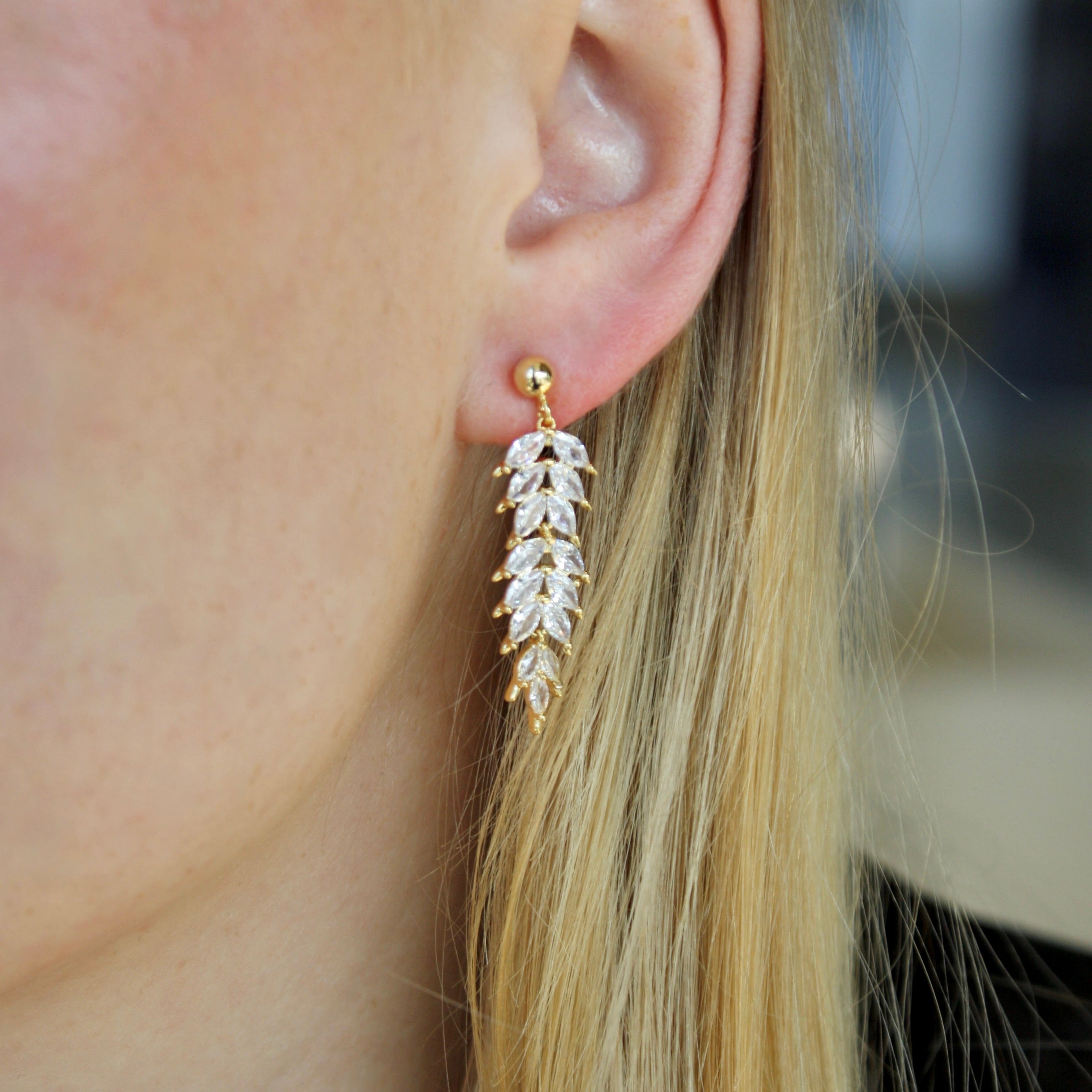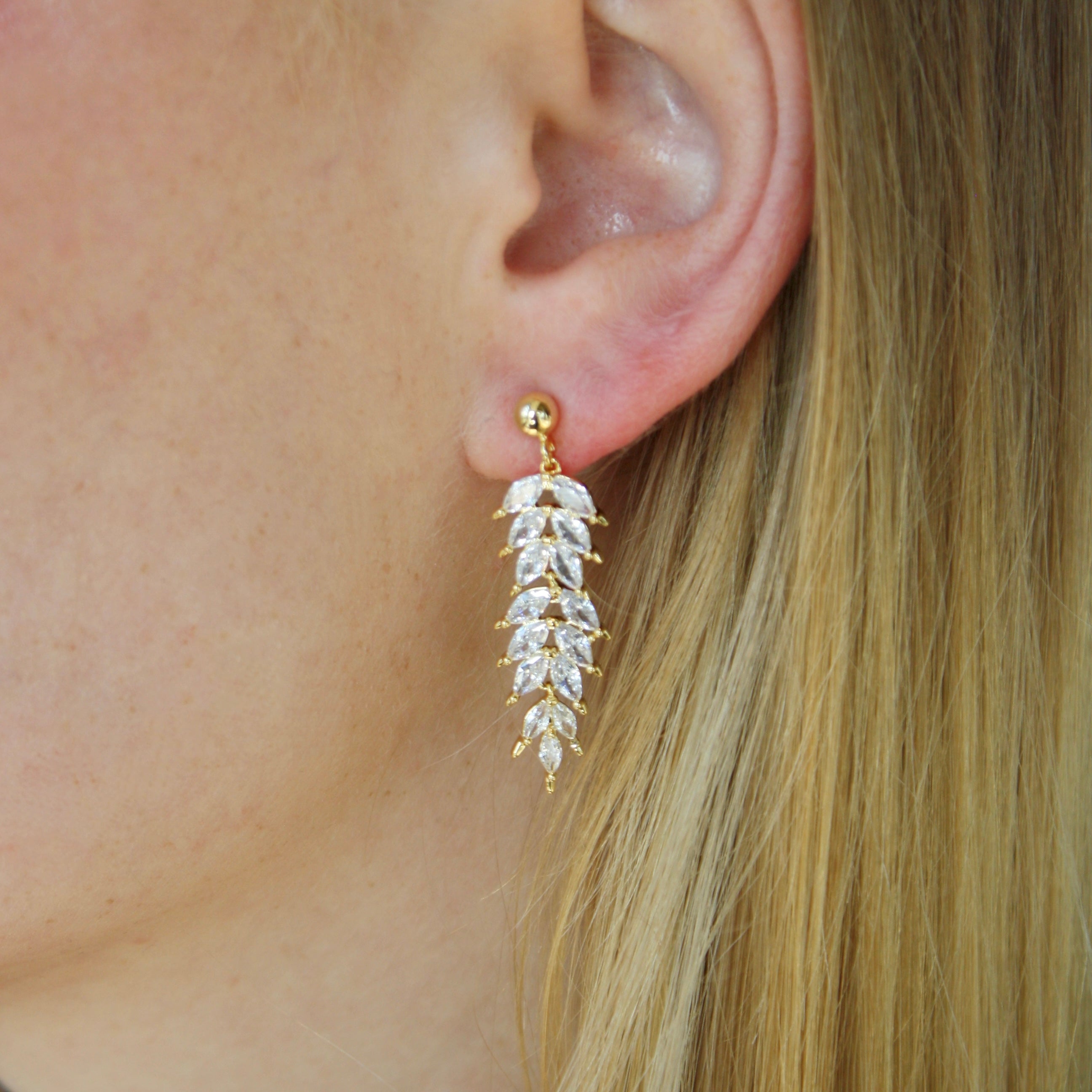 Exude opulence with our lightweight Crystal Leaf Drop Earrings. Designed with fine Zircon Crystals laid in a bed of 18K Gold-Copper blend. This dreamy piece will add an alluring shine to any look you create!