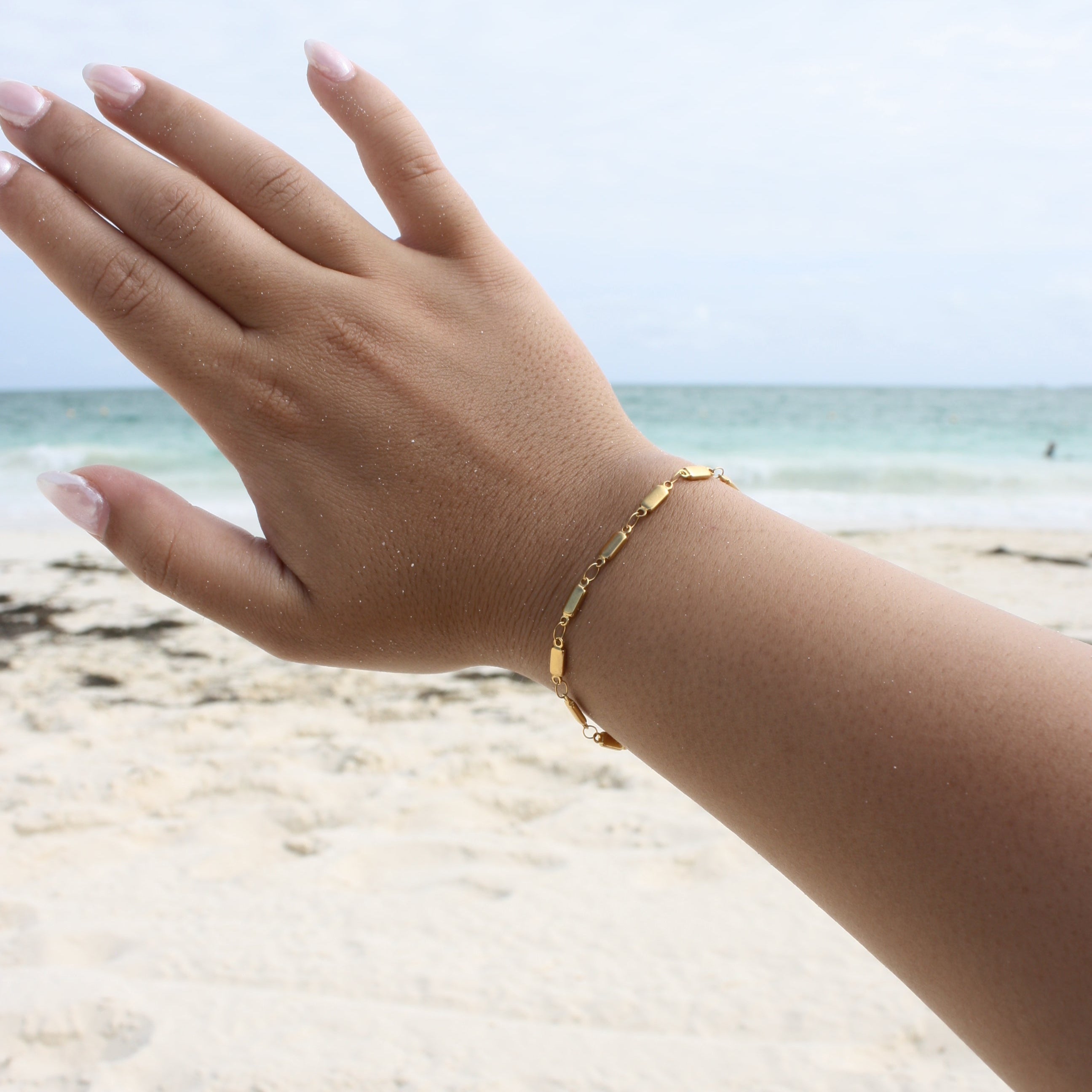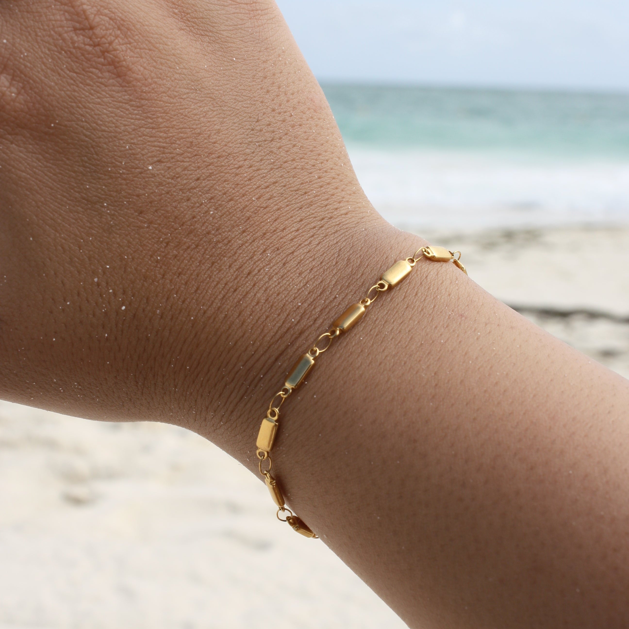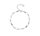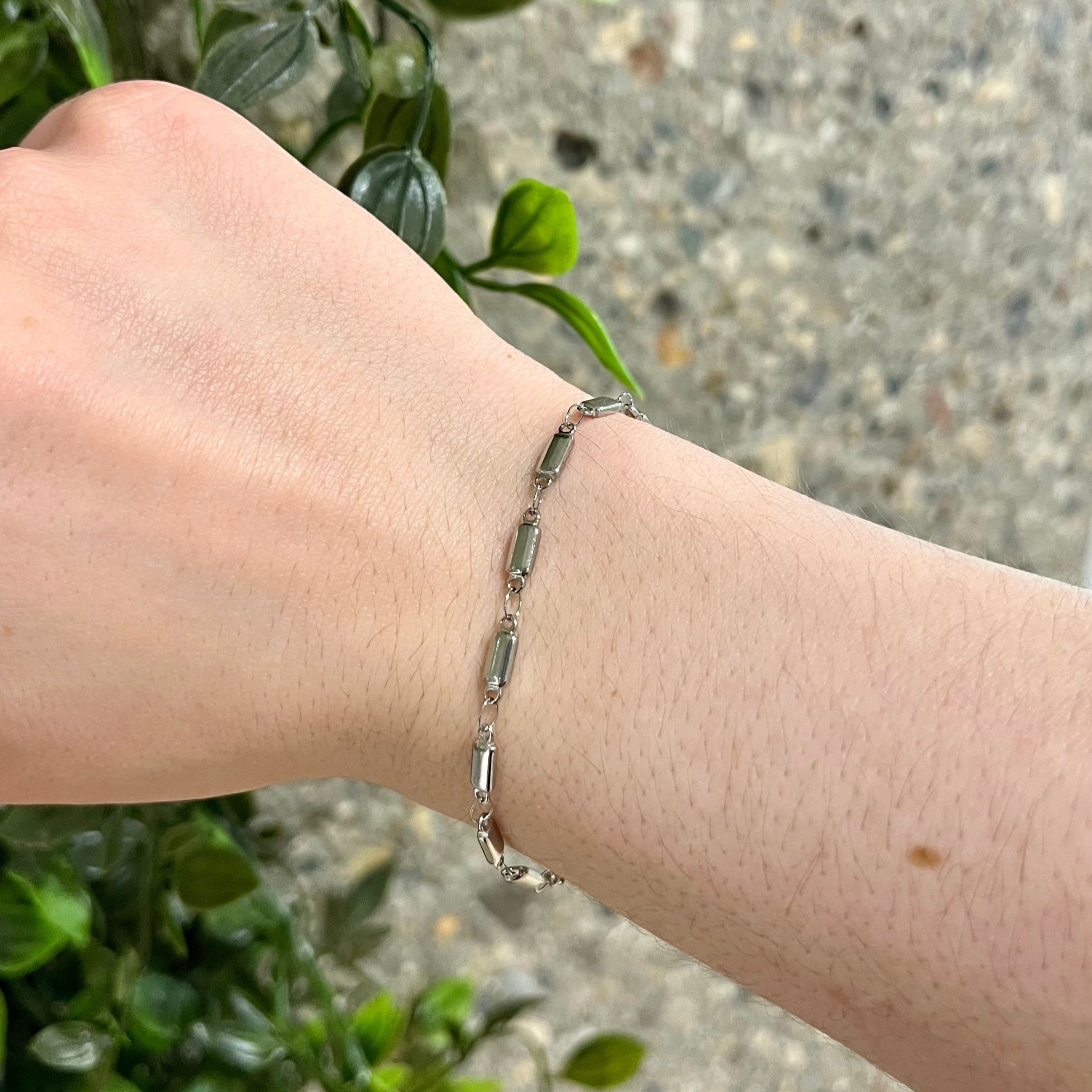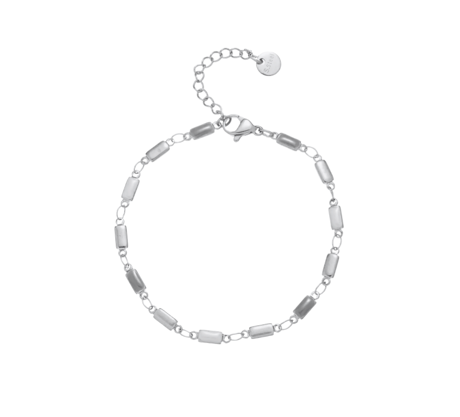 This sleek bracelet combines the solid look of a bangle and a chain link bracelet. It’s smooth shiny look adds the perfect touch of elegance to any look.