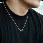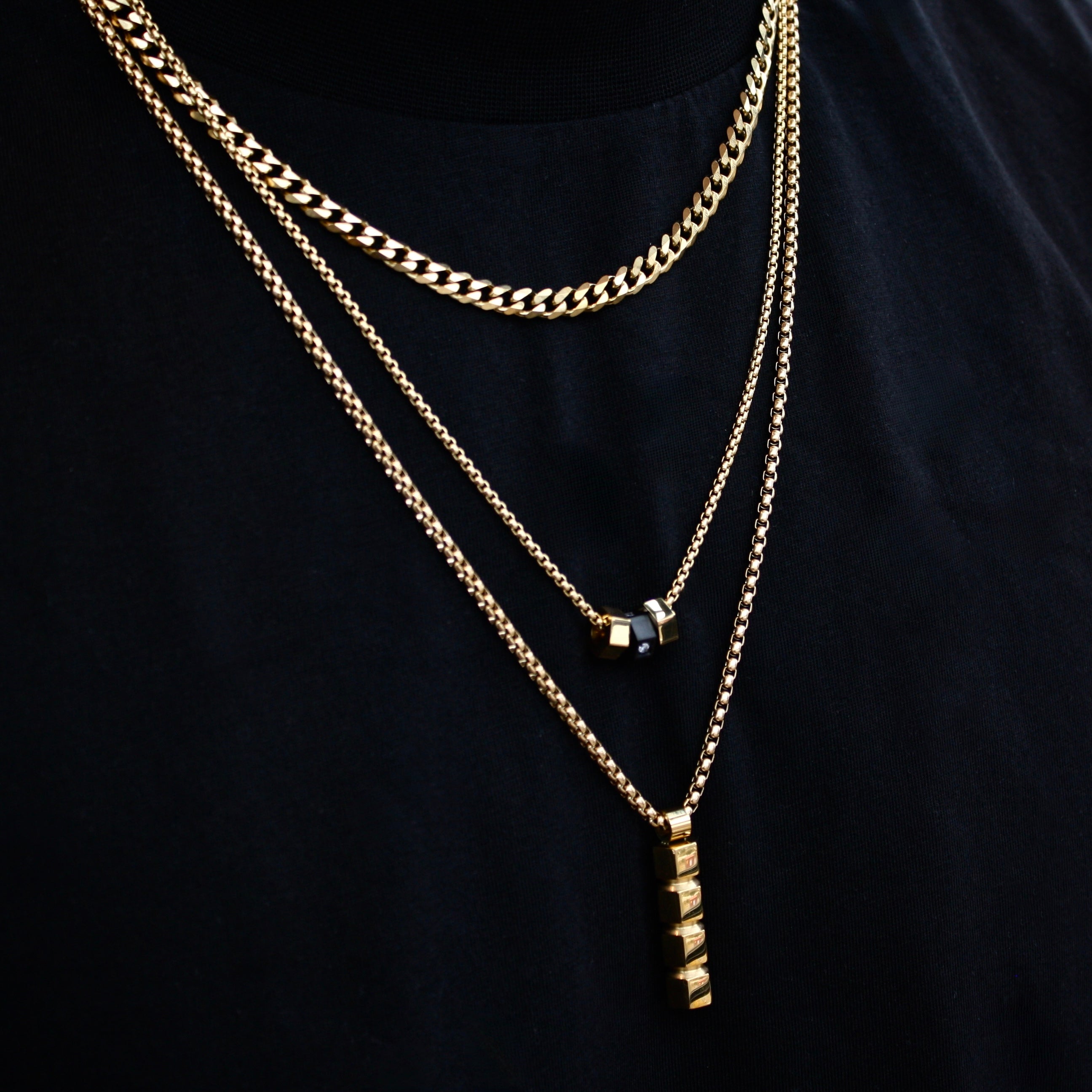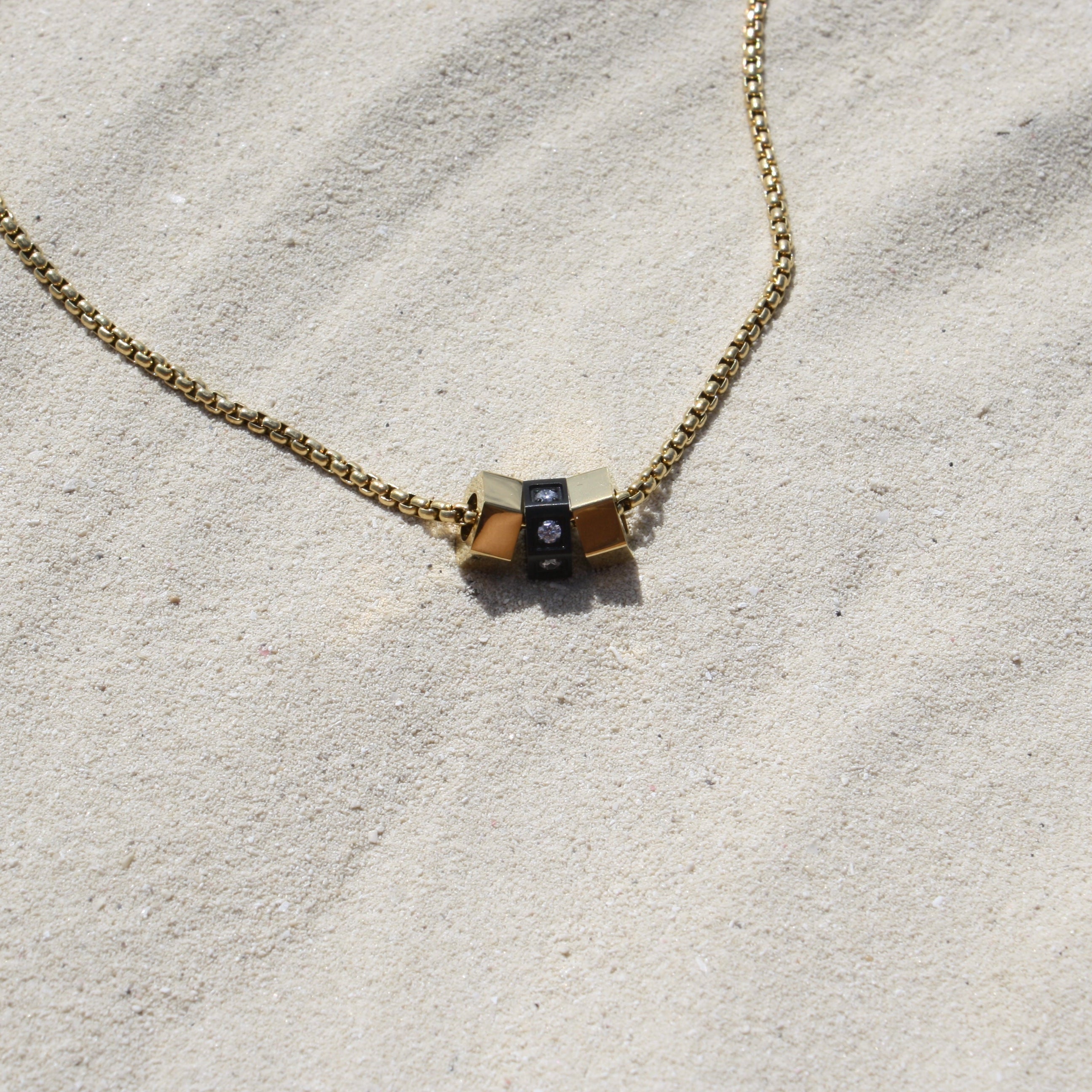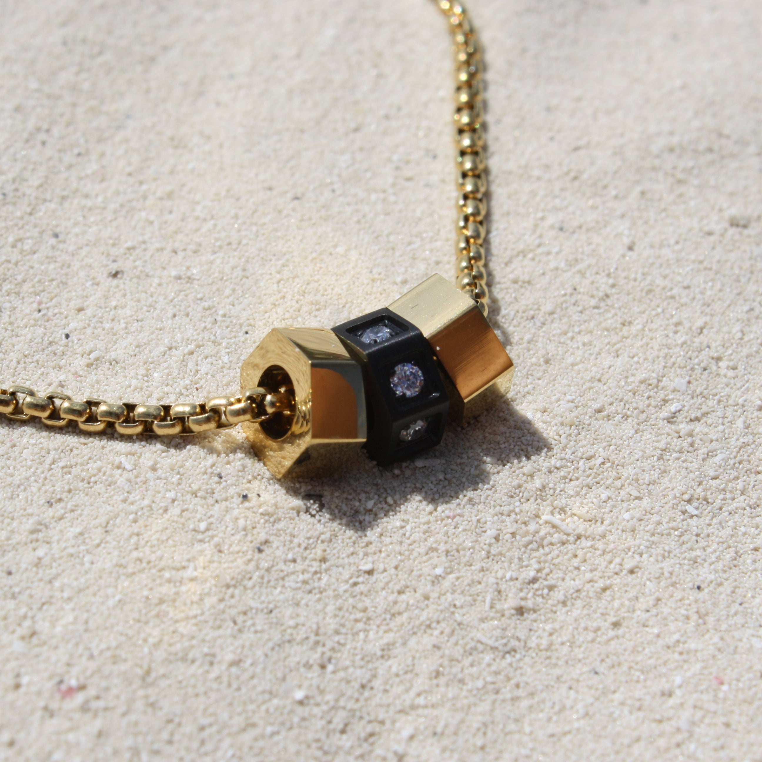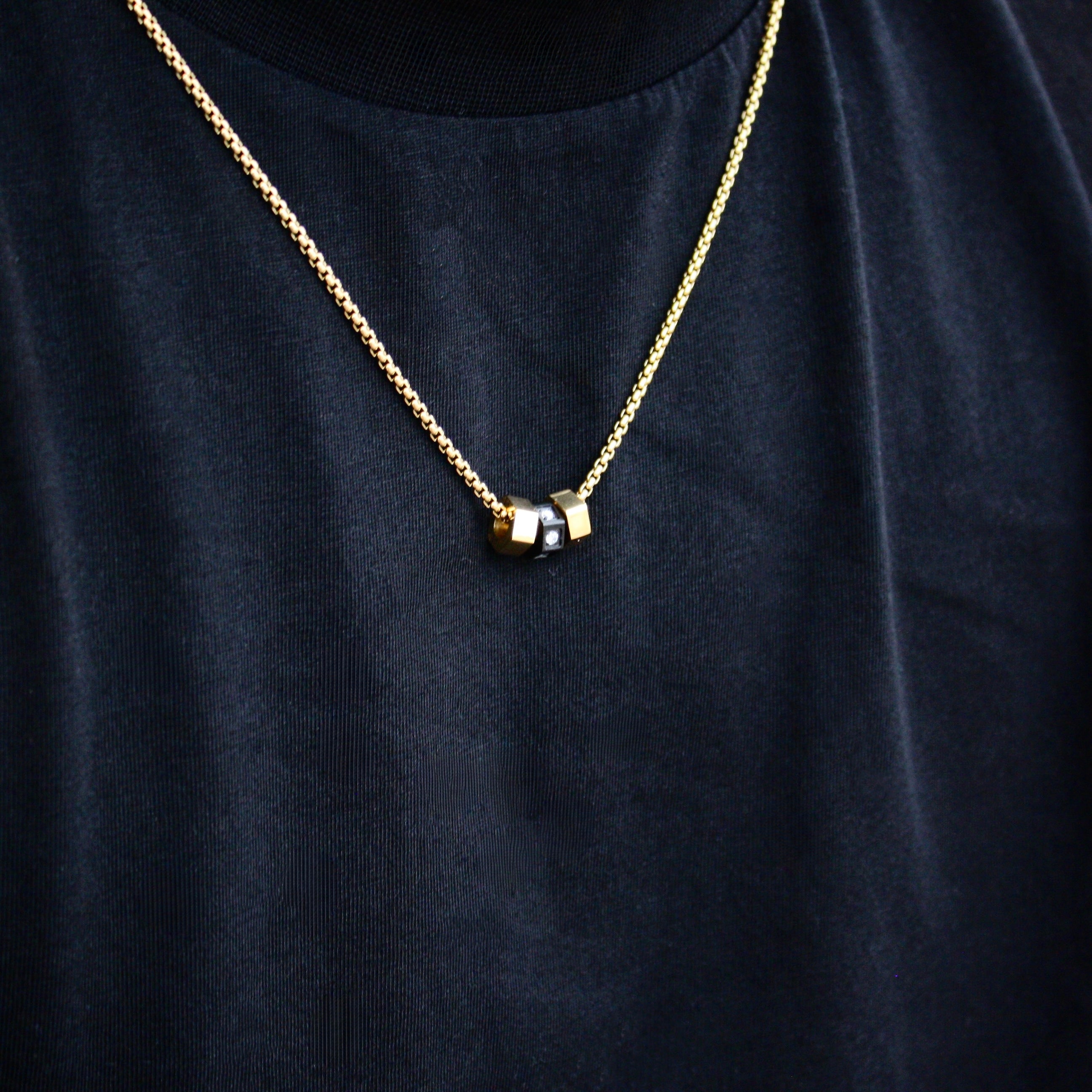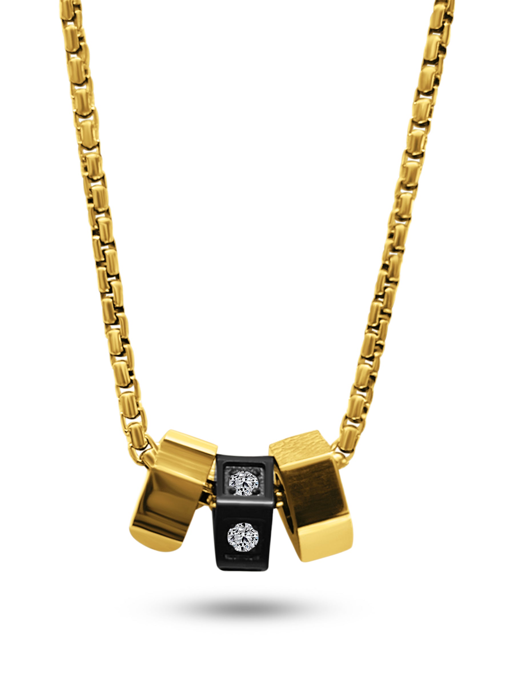 The necklace is designed with 18K gold plating on stainless steel, making it both durable and stylish. Its three ring pendant, including one black ring with CZ crystals, is perfect for fidgeting while maintaining a sophisticated look. With its sleek and classy design, this necklace is a must-have for any jewelry collection.