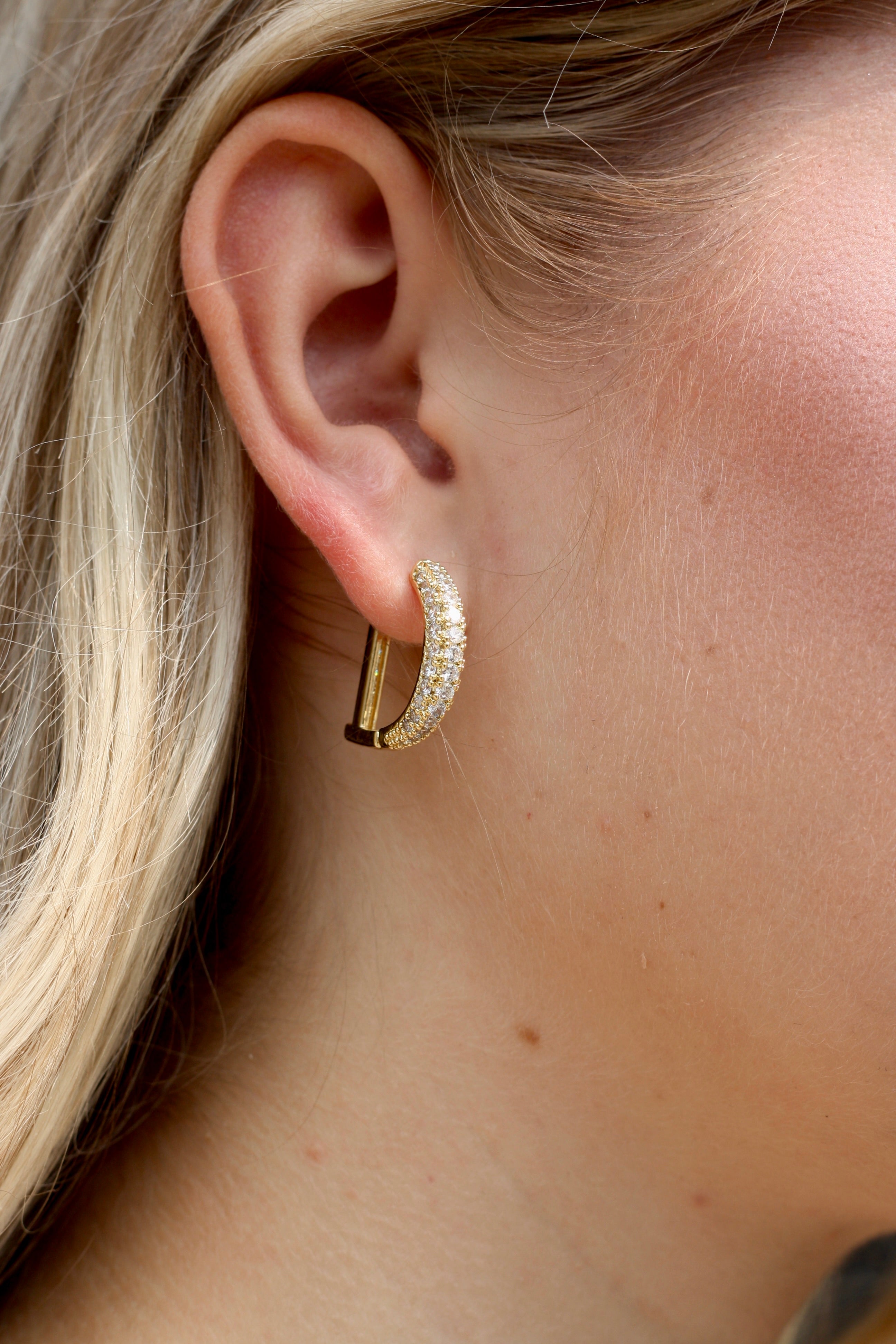The distinctive Curved Bezel Hoops are sure to shine. Fashioned with clear zircon crystals laid along a bed of gold vermeil & sterling silver. Created with a clip-to-close clasp for comfortable wear. Steal the show with this stunning design!