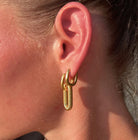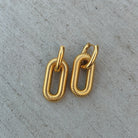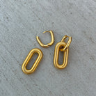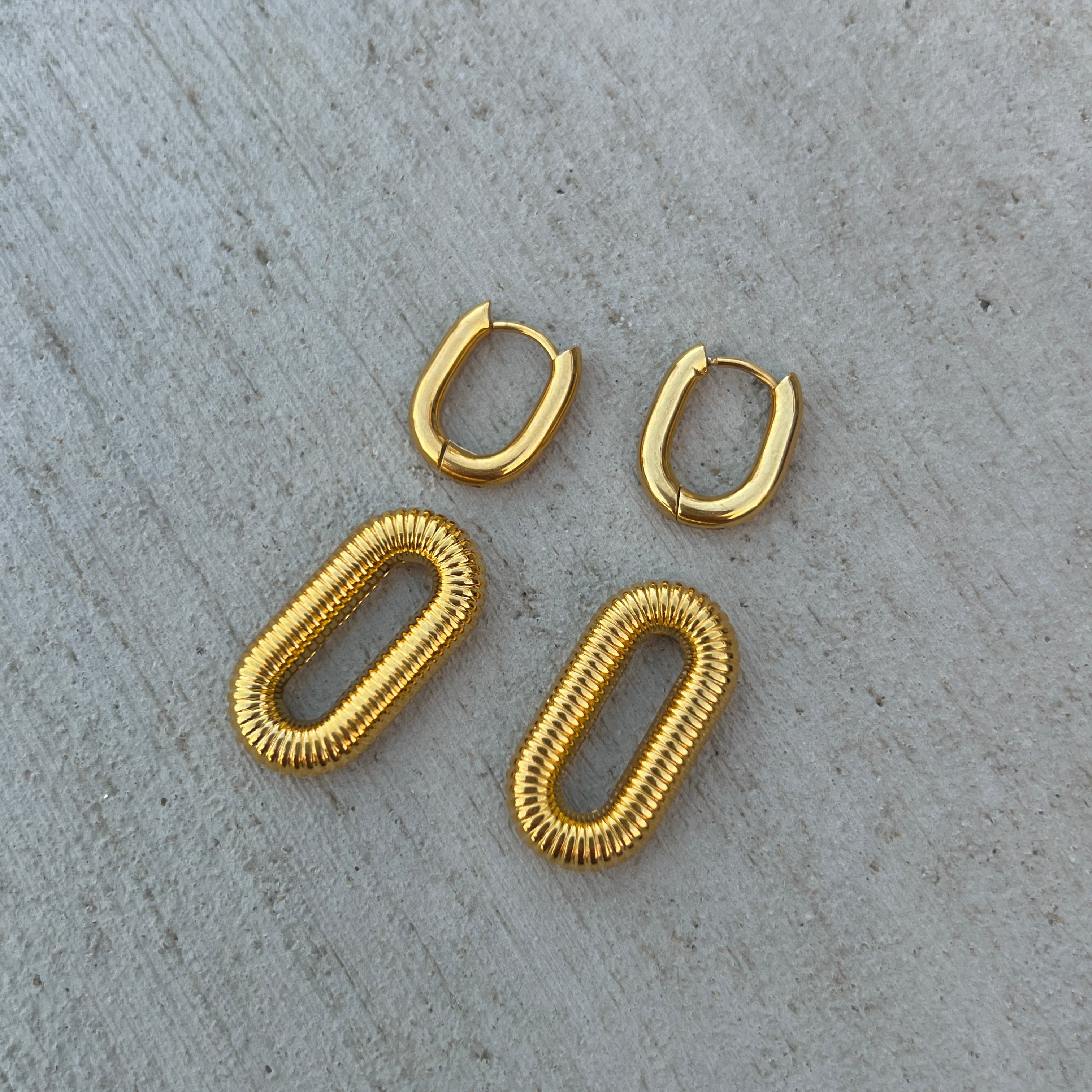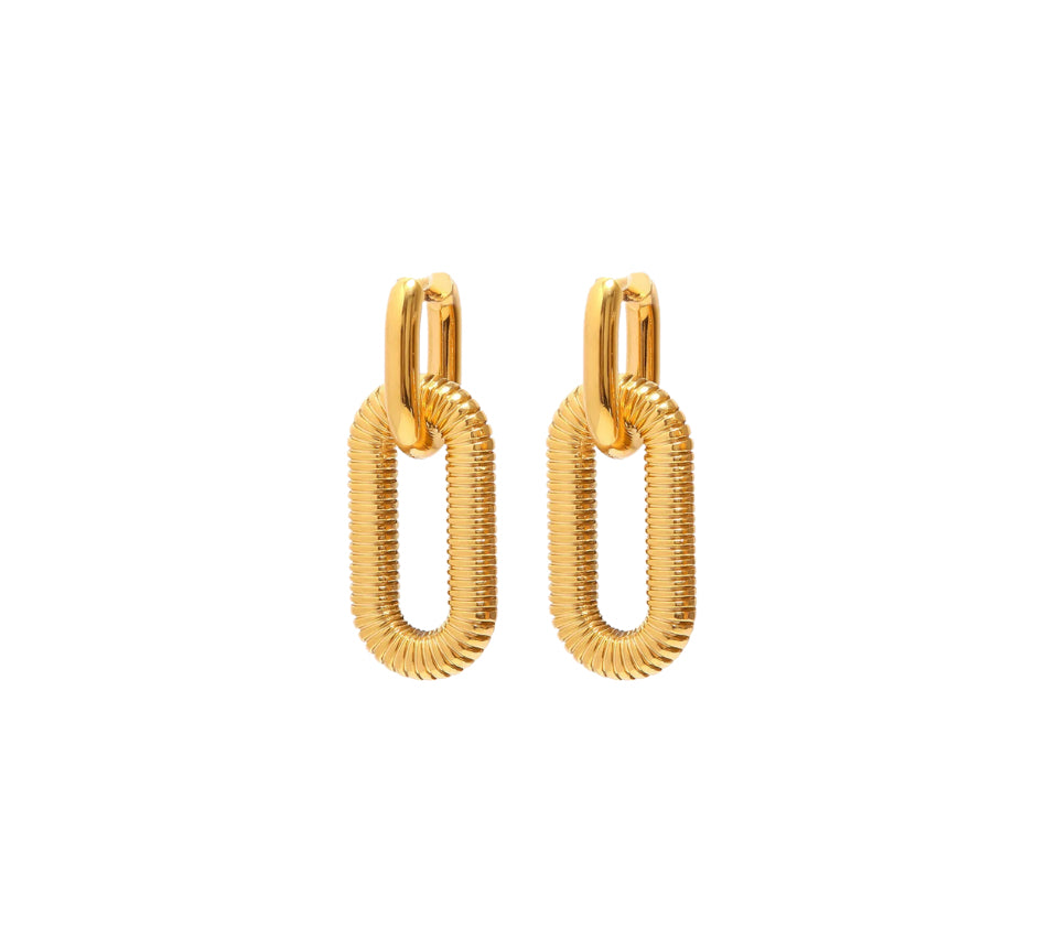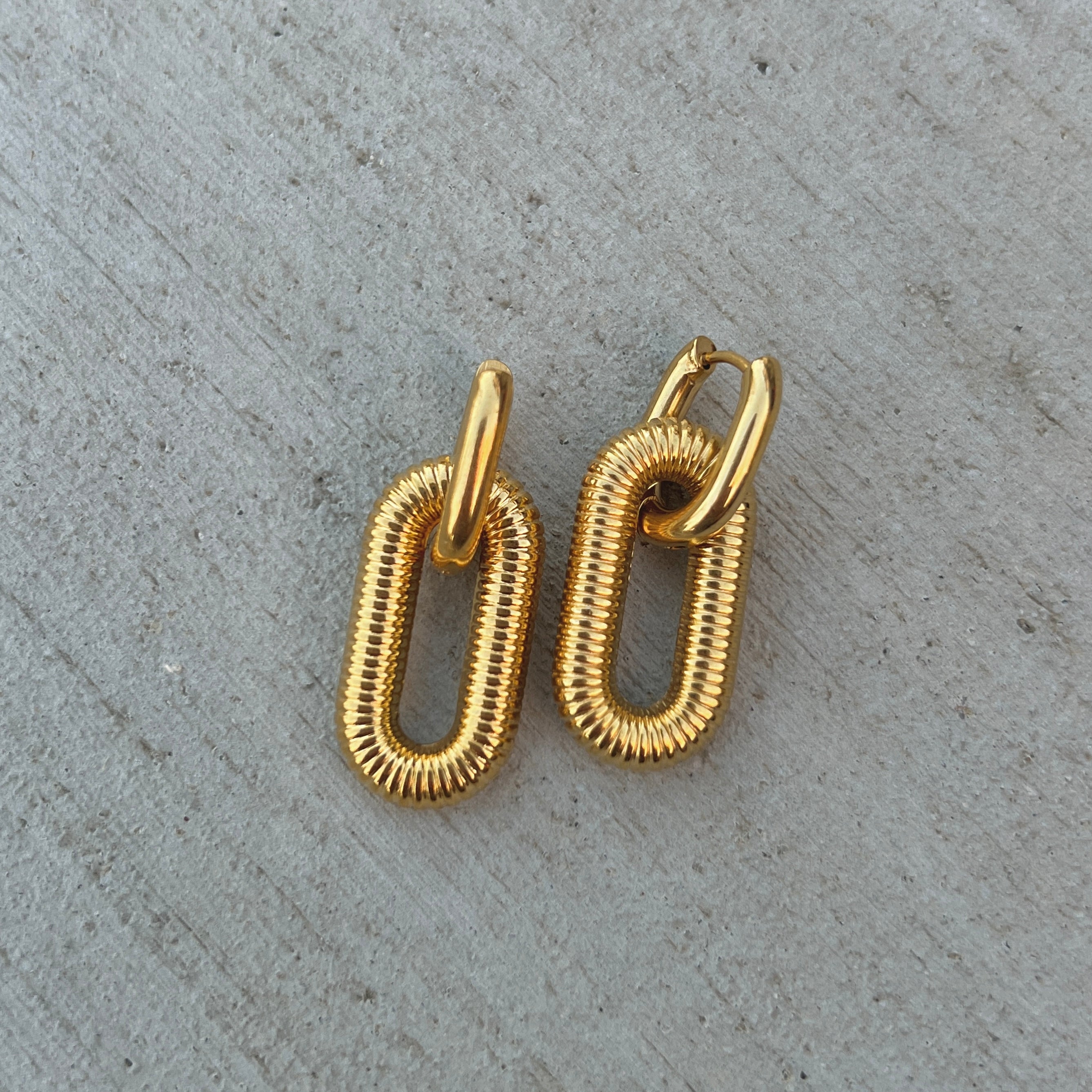 Expertly crafted from durable stainless steel, these Dangly Ribbed Link Hoops are designed with a modern twist. The double link feature adds a unique touch, and the removable hoop allows for versatile wear as a plain rectangle hoop. Elevate your everyday look with these stylish and functional hoops.