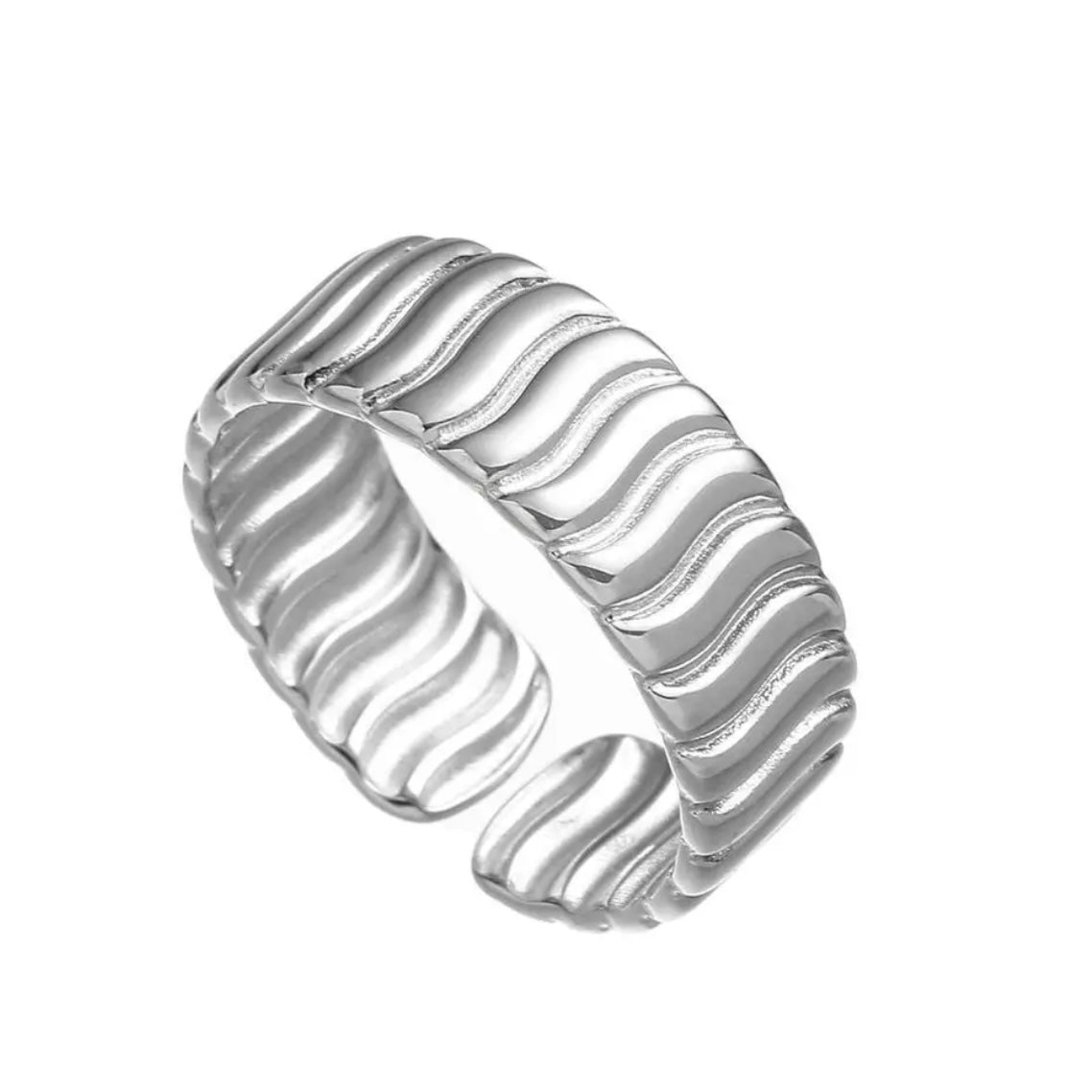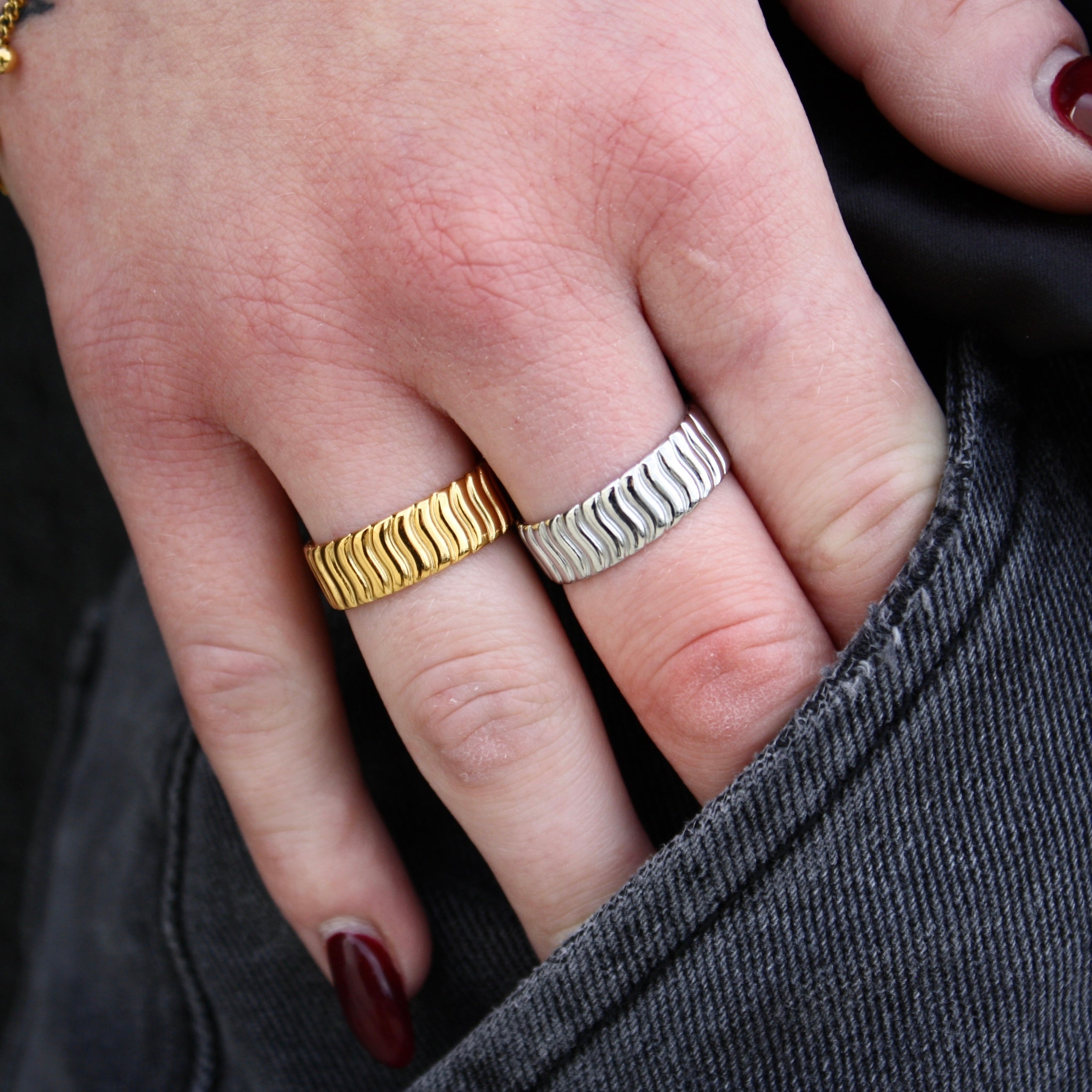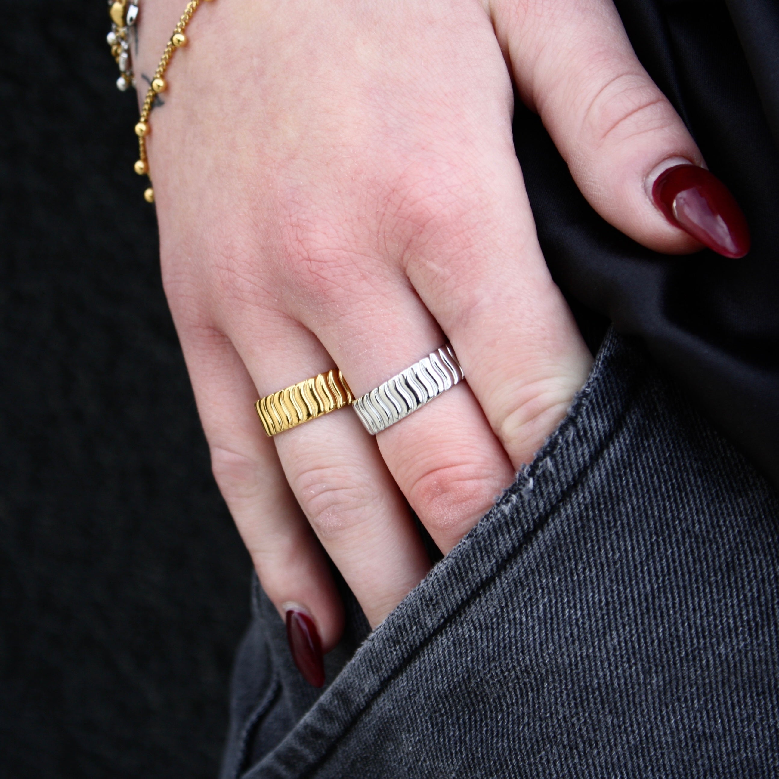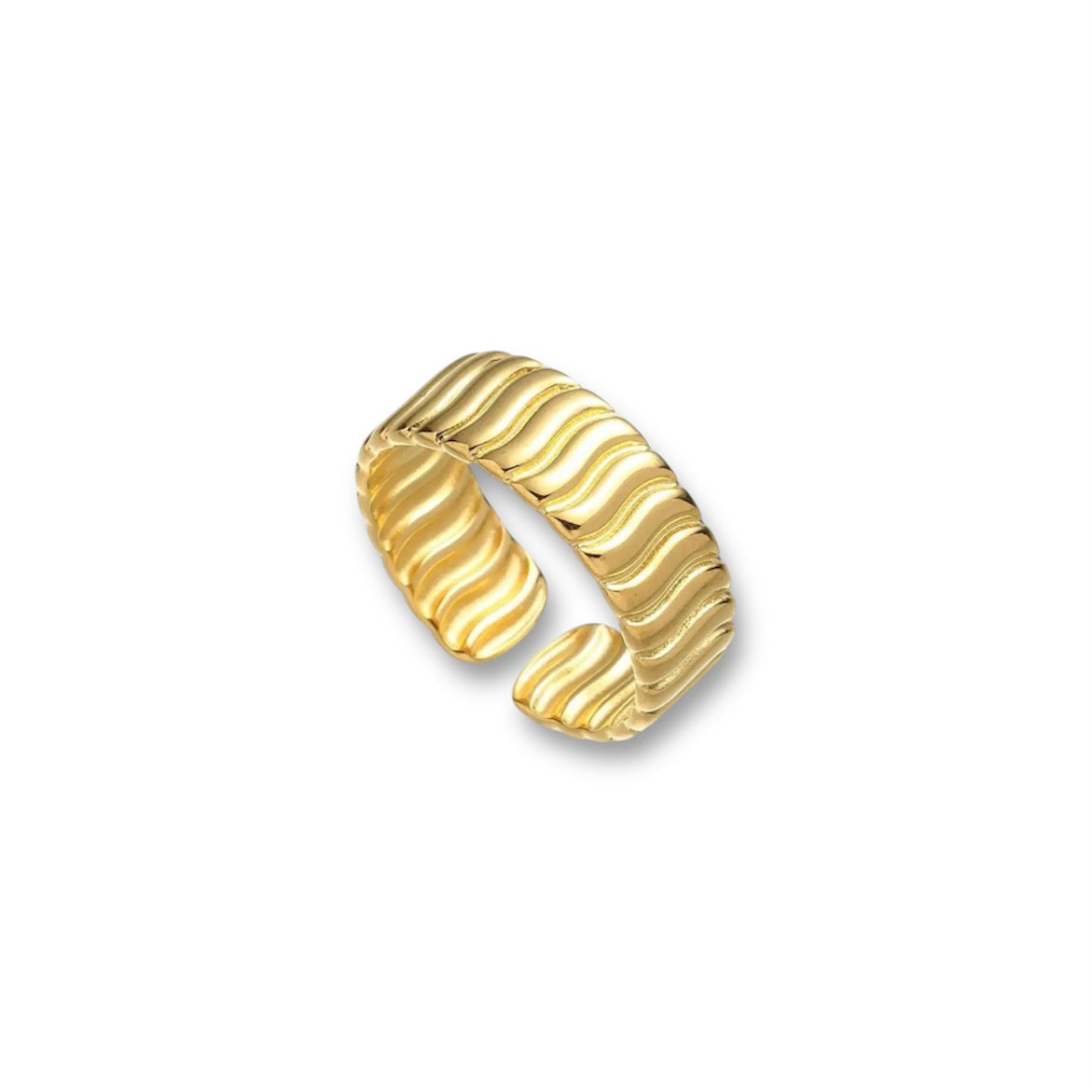 Enhance your stack with the Ribbed Wave Ring. Carefully crafted with 18K Gold filled with Stainless Steel, giving you a resilient piece. Features an adjustable mechanism so you can style it as you please. An ideal addition to your collection!