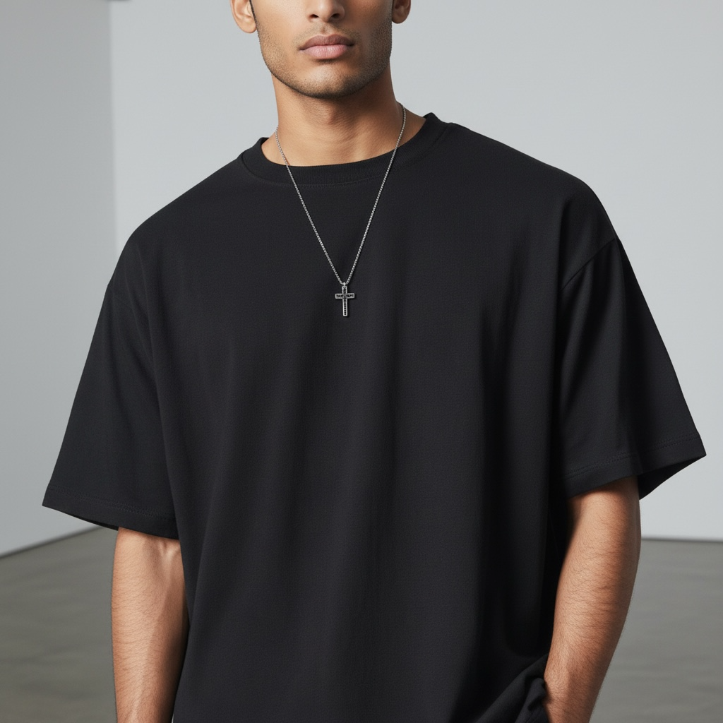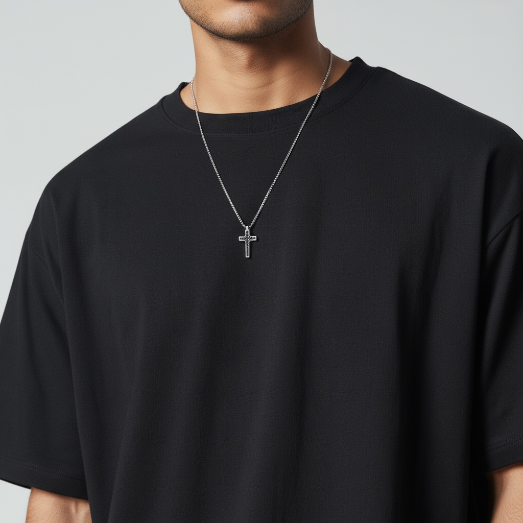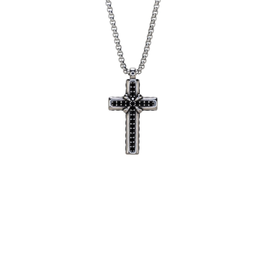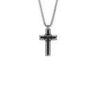 This black gem cross set features a masculine cross pendant with black cubic zirconia, available in stylish silver. Elevate any look with its sleek and sophisticated design. Perfect for those looking for an edgy yet timeless accessory.