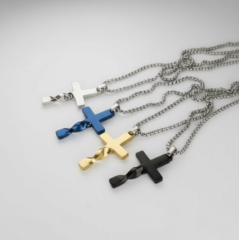 The Twist Cross Set features a unique twist design on the bottom of the cross pendants. Crafted in silver, gold, blue, and black, this set offers a variety of options for any personal style. Elevate your everyday look with this modern twist on a traditional symbol.