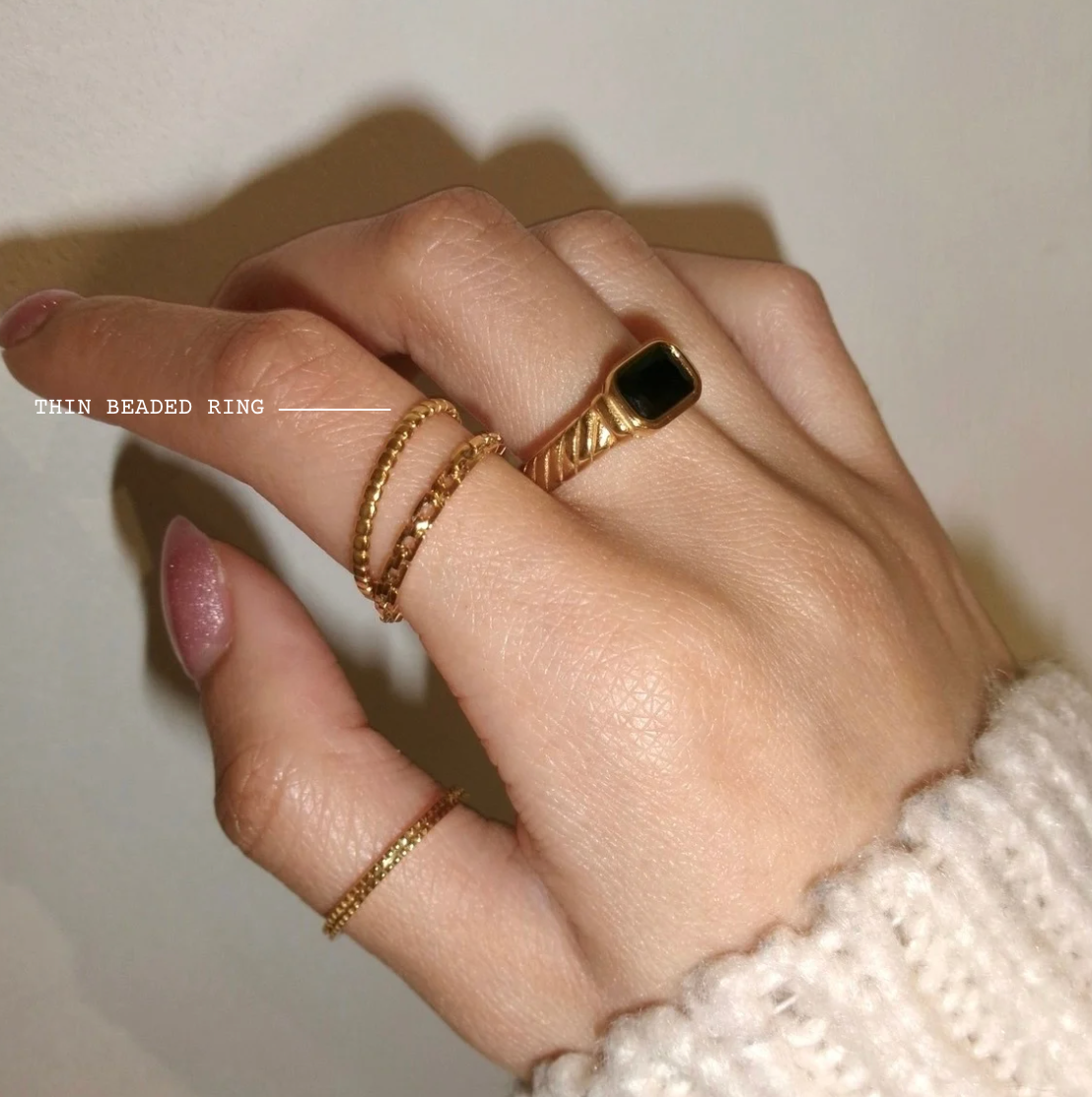Delicate beaded detailing adorns this stackable ring, designed for layering with other pieces in your collection. Crafted to withstand daily wear, it resists water damage while maintaining its refined aesthetic. Perfect for creating personalized combinations that reflect your individual style.