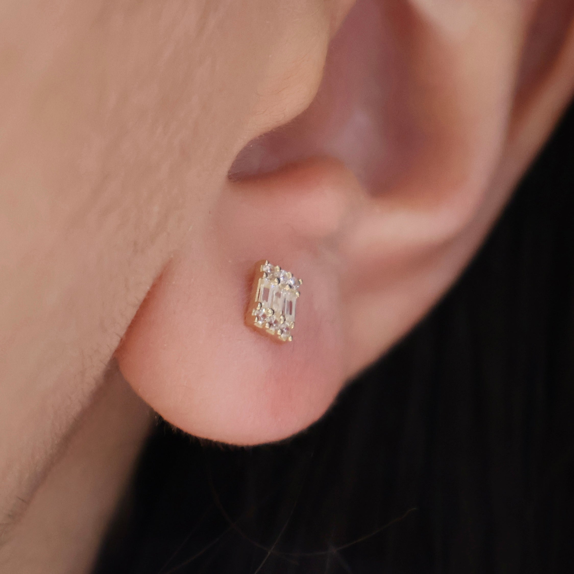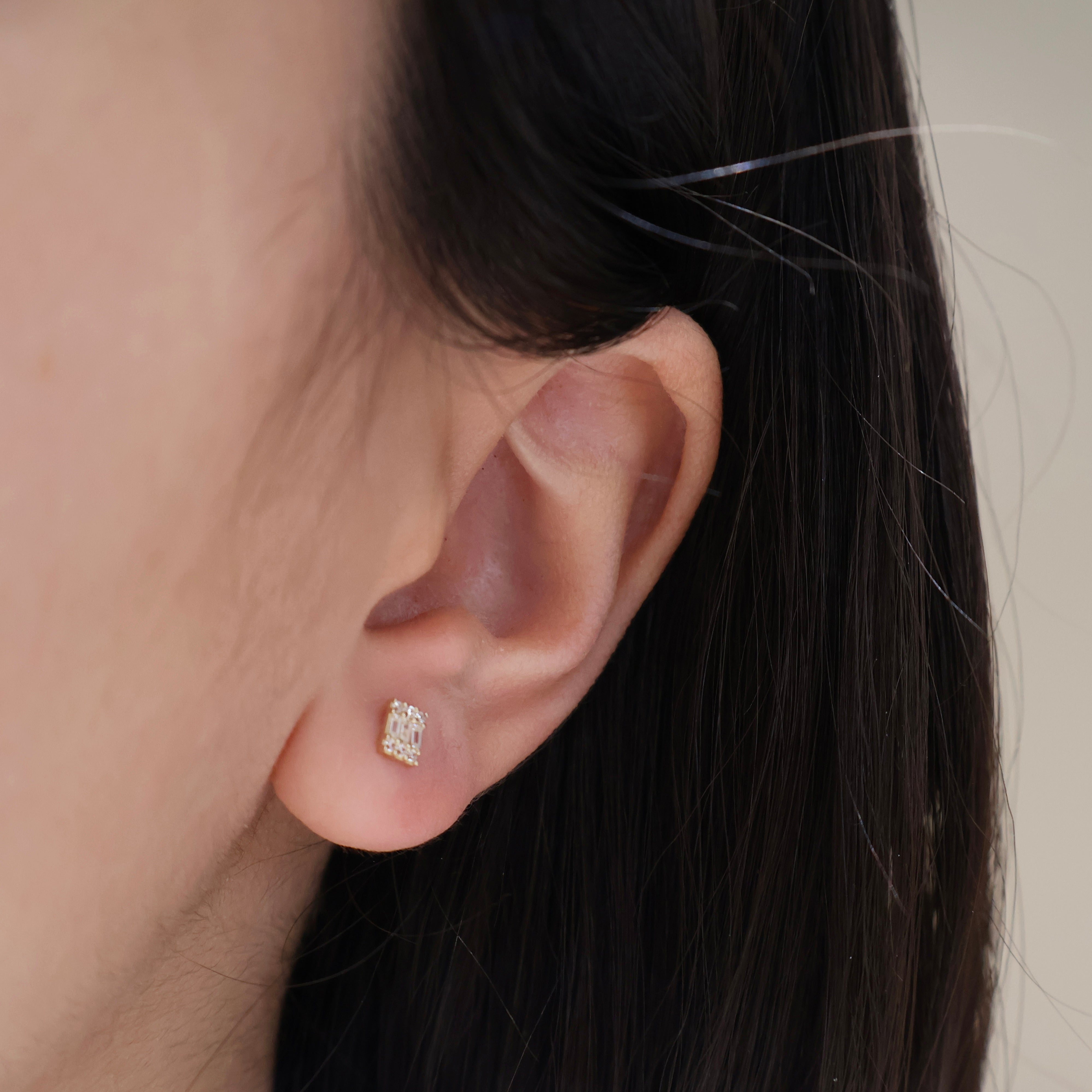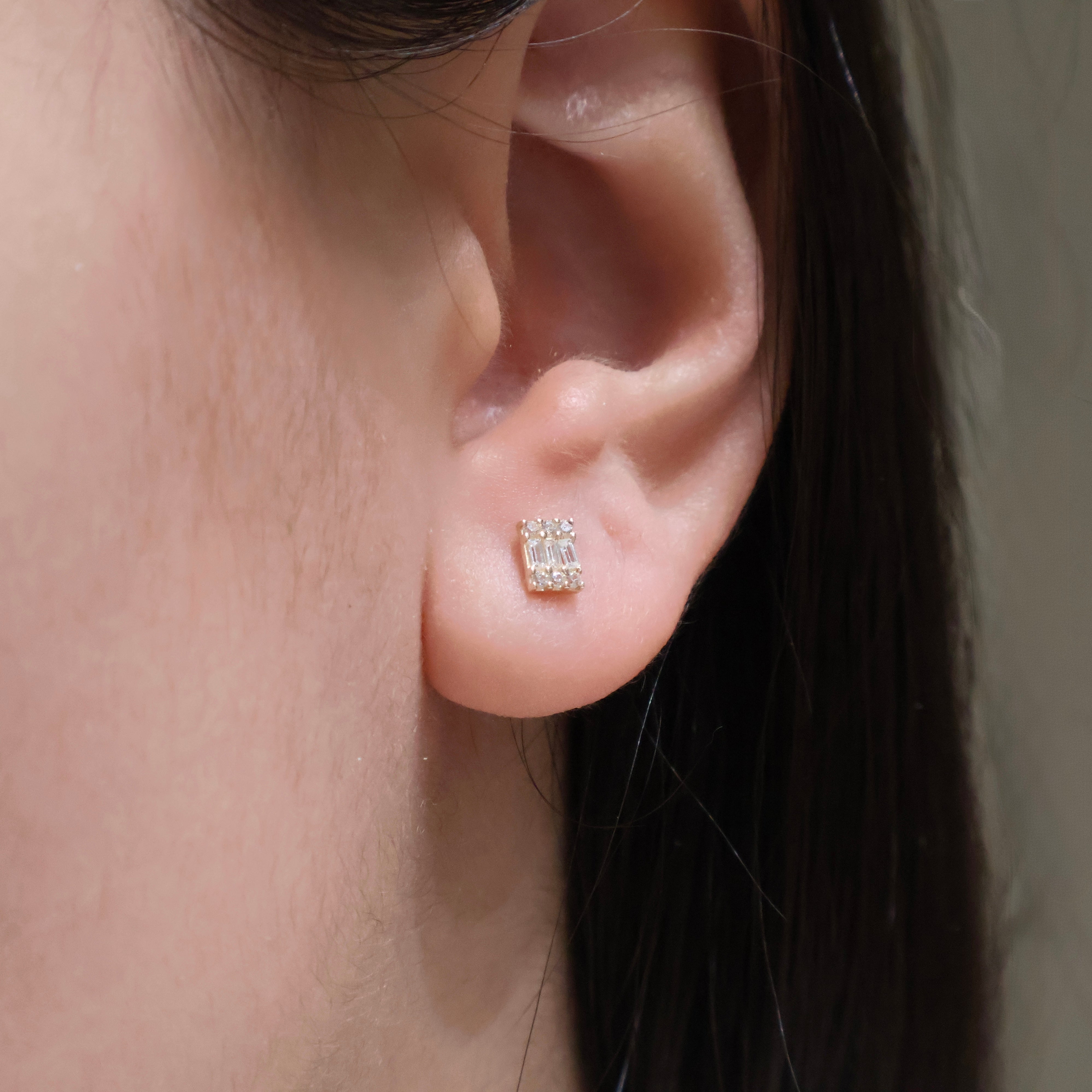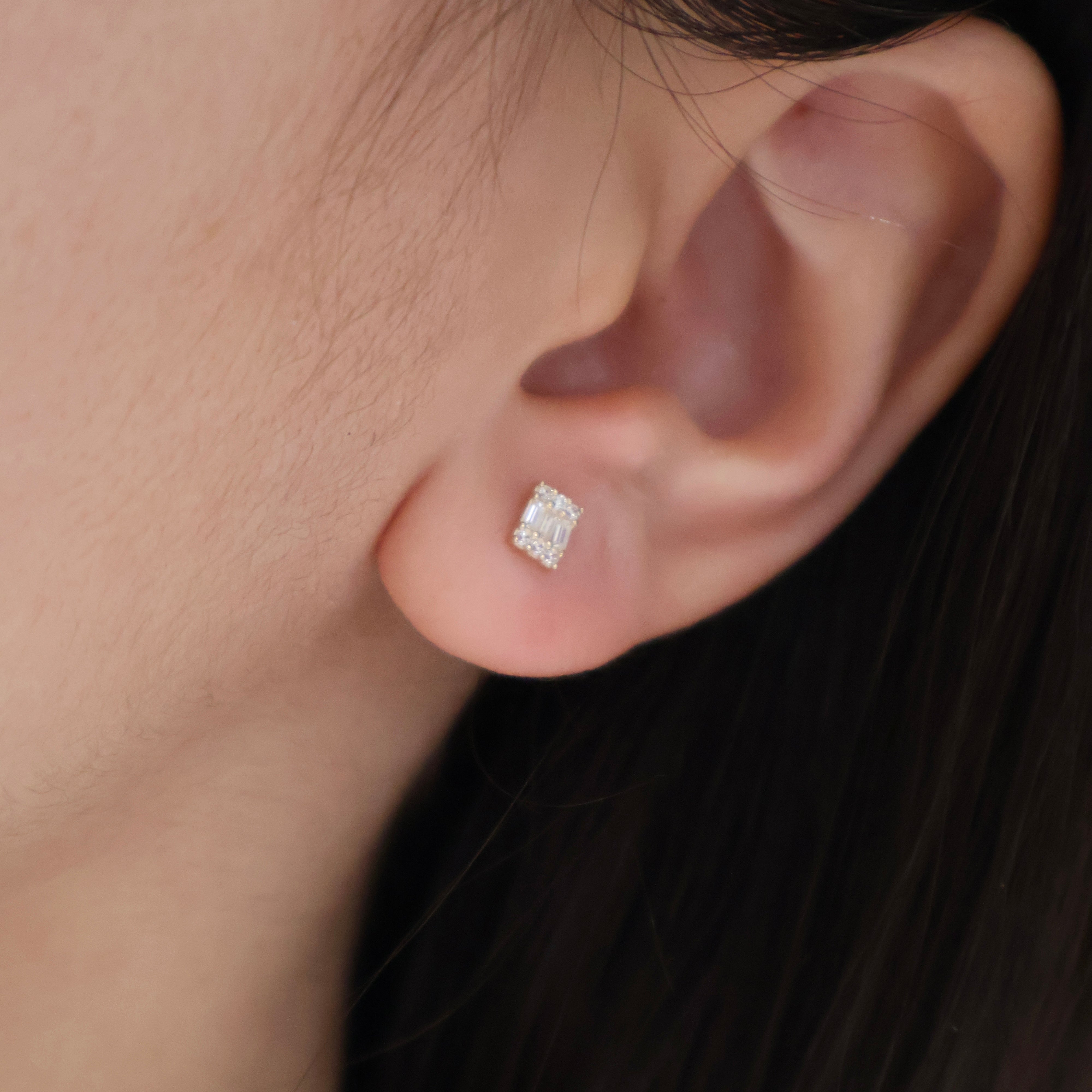 Delicate 14K solid gold studs featuring baguette and round-cut cubic zirconia crystals. These versatile pieces layer seamlessly with other jewelry while delivering understated sparkle. A refined essential for everyday wear or special occasions.
